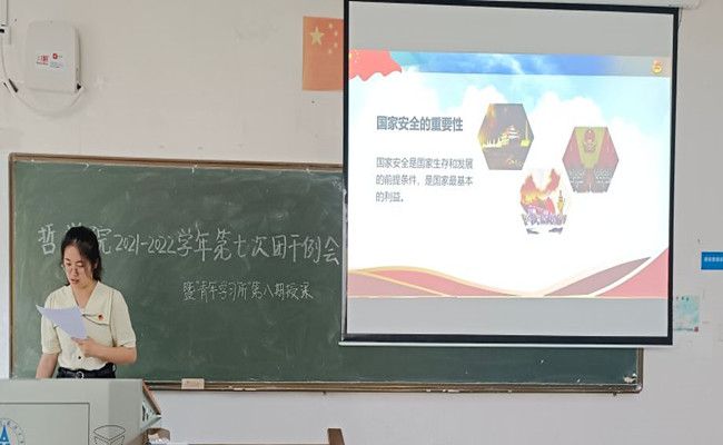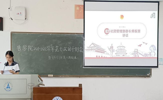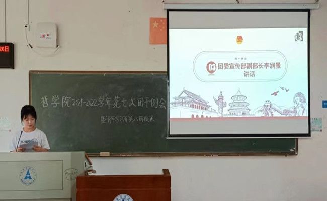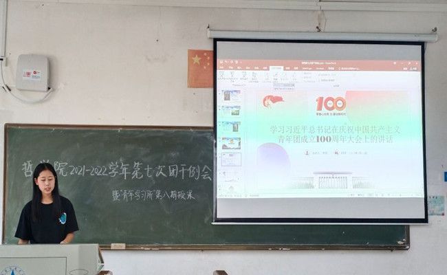 会议最后,社团管理部干事戴雅雯、团委宣传部干事李嫚进行“青年学习所第八期培训”。戴雅雯介绍了“东风快递”——中国人民解放军火箭军的由来以及东风系列导弹,并结合国内外形势阐述了导弹研发以及火箭军存在的必要性。李嫚带领大家学习了习近平总书记在共产主义青年团成立一百周年庆祝大会上的讲话精神。通过重温习近平总书记的讲话,再次强调了青年团员砥砺奋进的重要性。